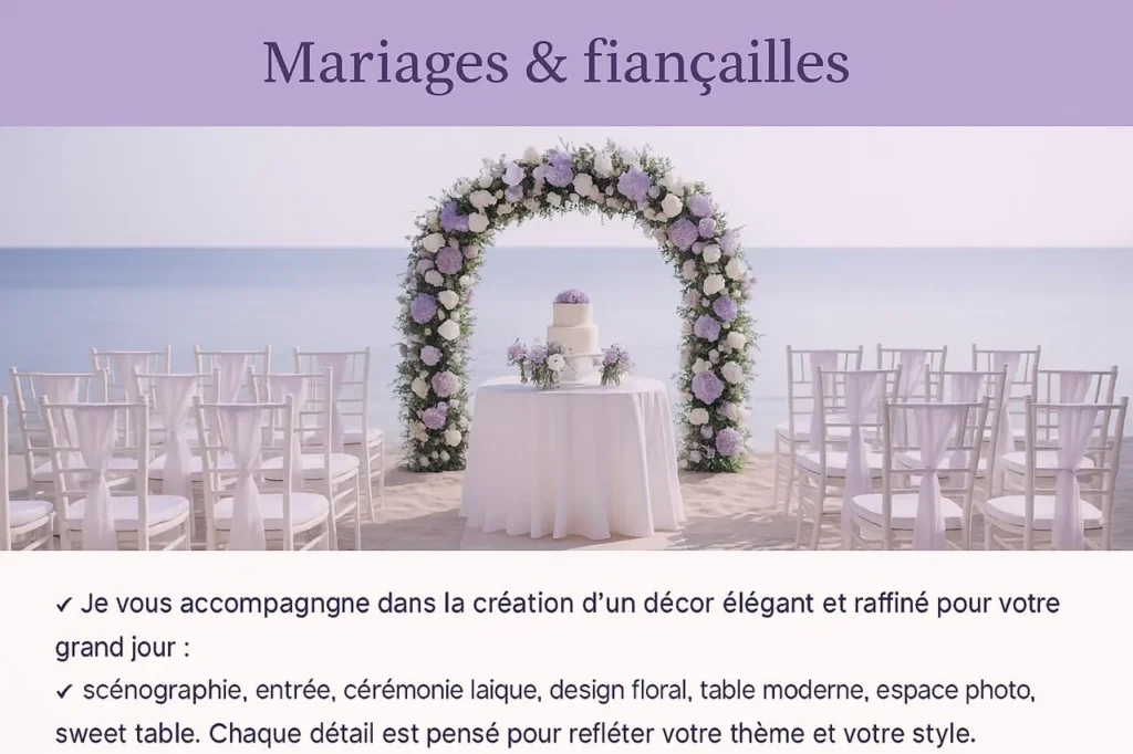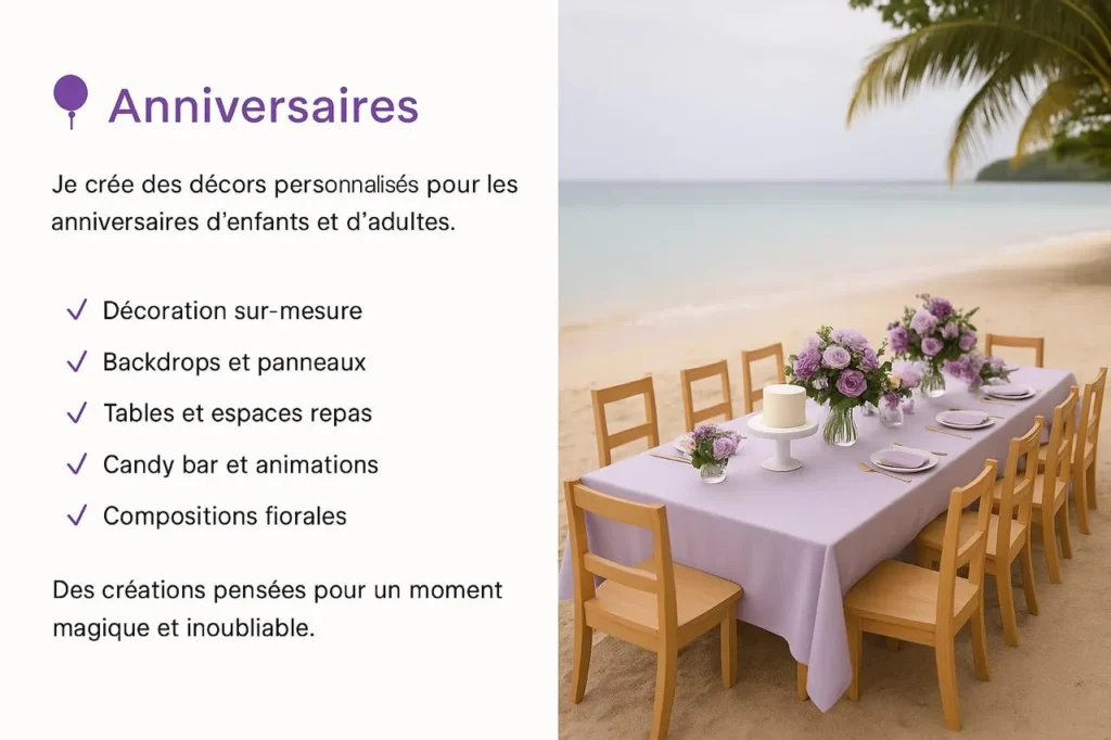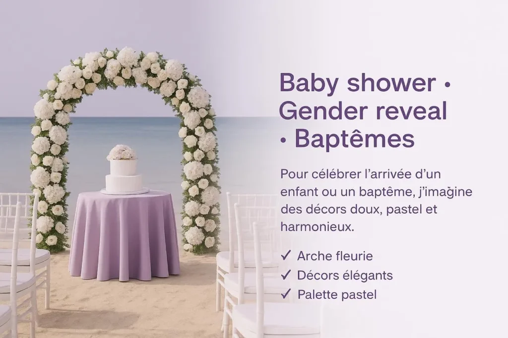Je vous accompagne pour sublimer vos événements : anniversaires, mariages, baby showers, baptêmes, fiançailles et évènements professionnels.